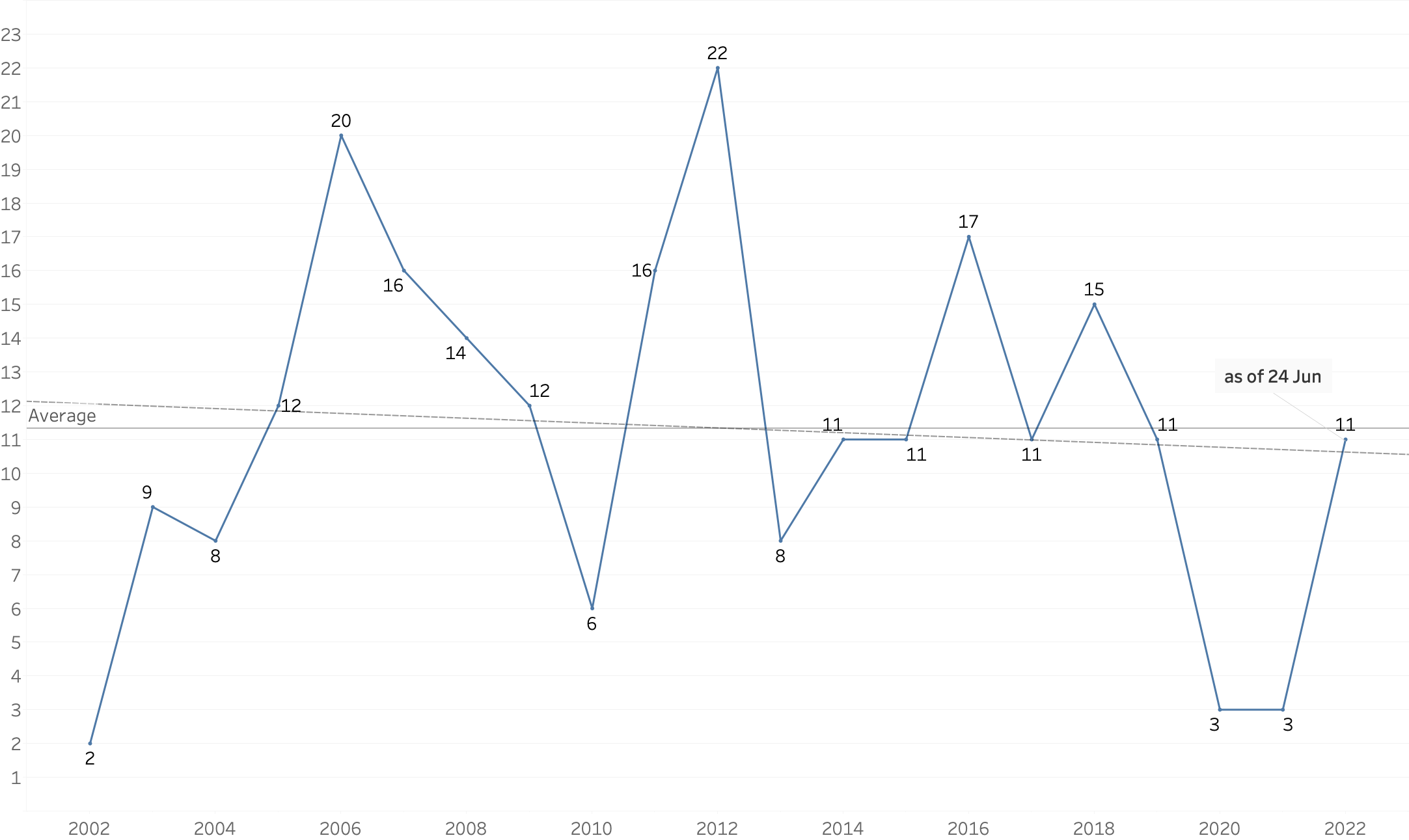 Al-Qaeda Emir Ayman al-Zawahiri is on track to set a new audio/video annual release rate record in 2022. He has so far had 11 audio/video releases for 2022, as of 24 Jun.. If al-Zawahiri sustains the current 2022 rate of one release every 15.9 days, he will set a new annual record. His current record was set in 2012 when he had 22 releases. His daily release rate is up 667% from 2021 and he has already tied his highest annual rate from the past three years which was 11 in 2019.