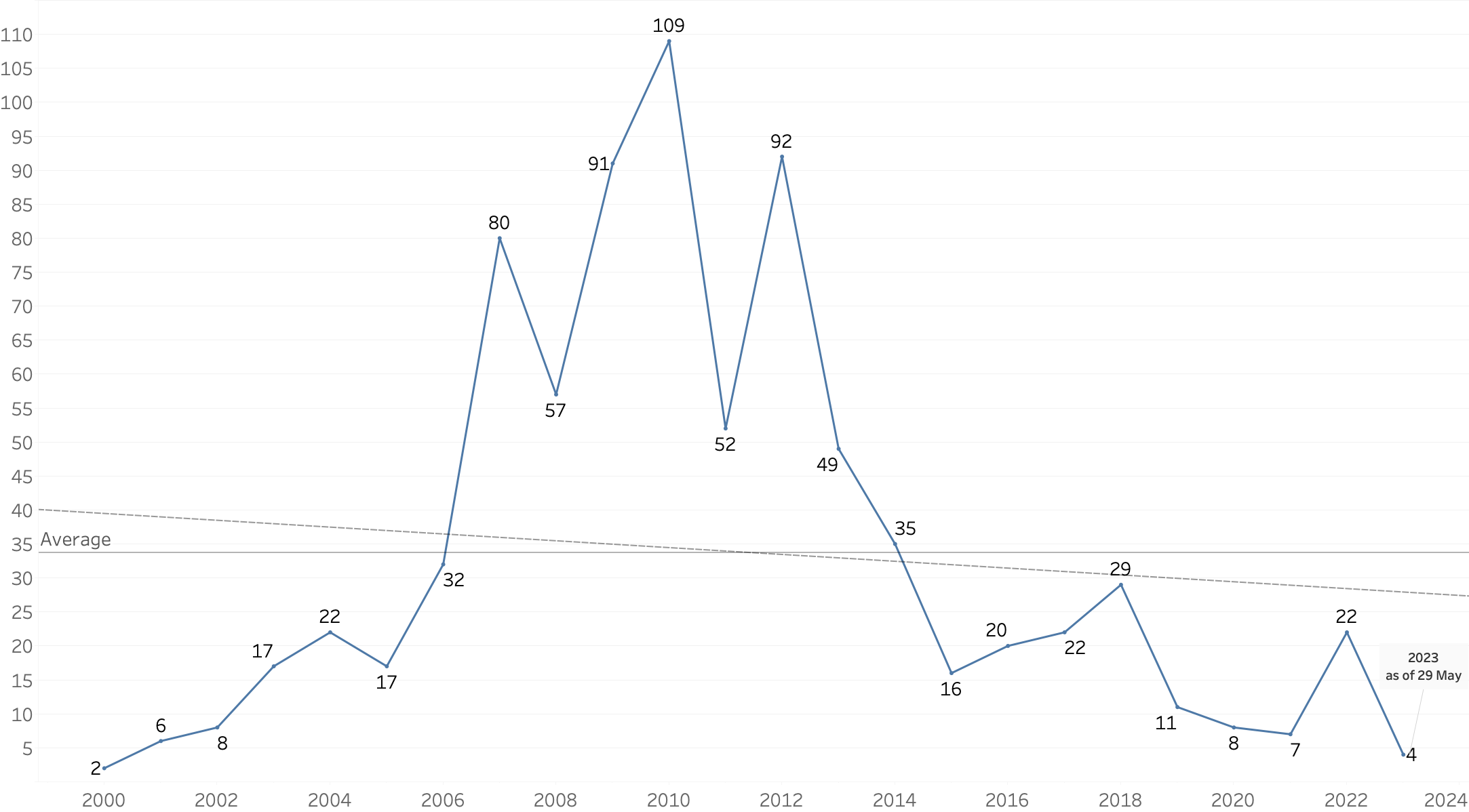 Al-Qaeda's as-Sahab audio/video annual release rate was up 214% in 2022 from 2021. The spike in releases reversed the record lows of the three prior years, however, 2023 is now on track to return as-Sahab to record low levels. In 2022, it had 22 releases at a release rate of one every 16.59 days compared to 2021 when it had seven releases at a rate of one every 52.14 days. In 2023, it had four releases as of 29 May at a release rate of one every 48 days. The 2022 increase put it 83% above its average annual release rate of 12 per year for 2020 to 2022. It is 37% below its average annual release rate of 35 per year for 2000 to 2022.