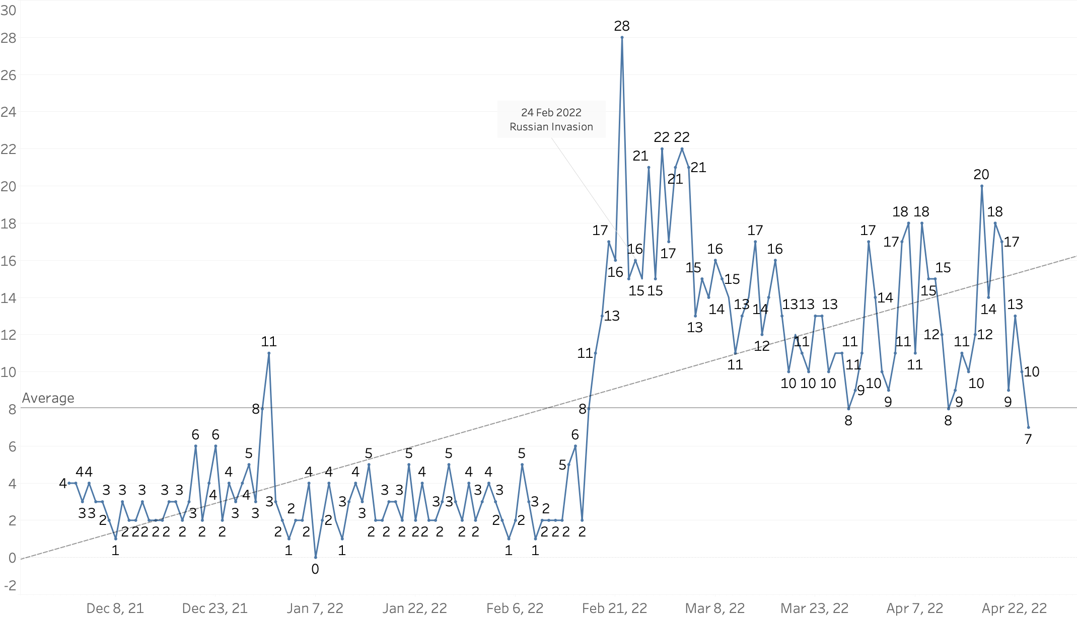 The Donetsk People's Republic (DPR) and Luhansk People's Republic (LPR) significantly stepped up audio/video releases in the days just prior to the Russian invasion of Ukraine and have sustained that effort since. The daily release rate has increased by 355% from 3.05 releases a day for 1 Dec. 2021 to 16 Feb. 2022 to 13.87 releases a day for 17 Feb. 2022 to 24 Apr. 2022.